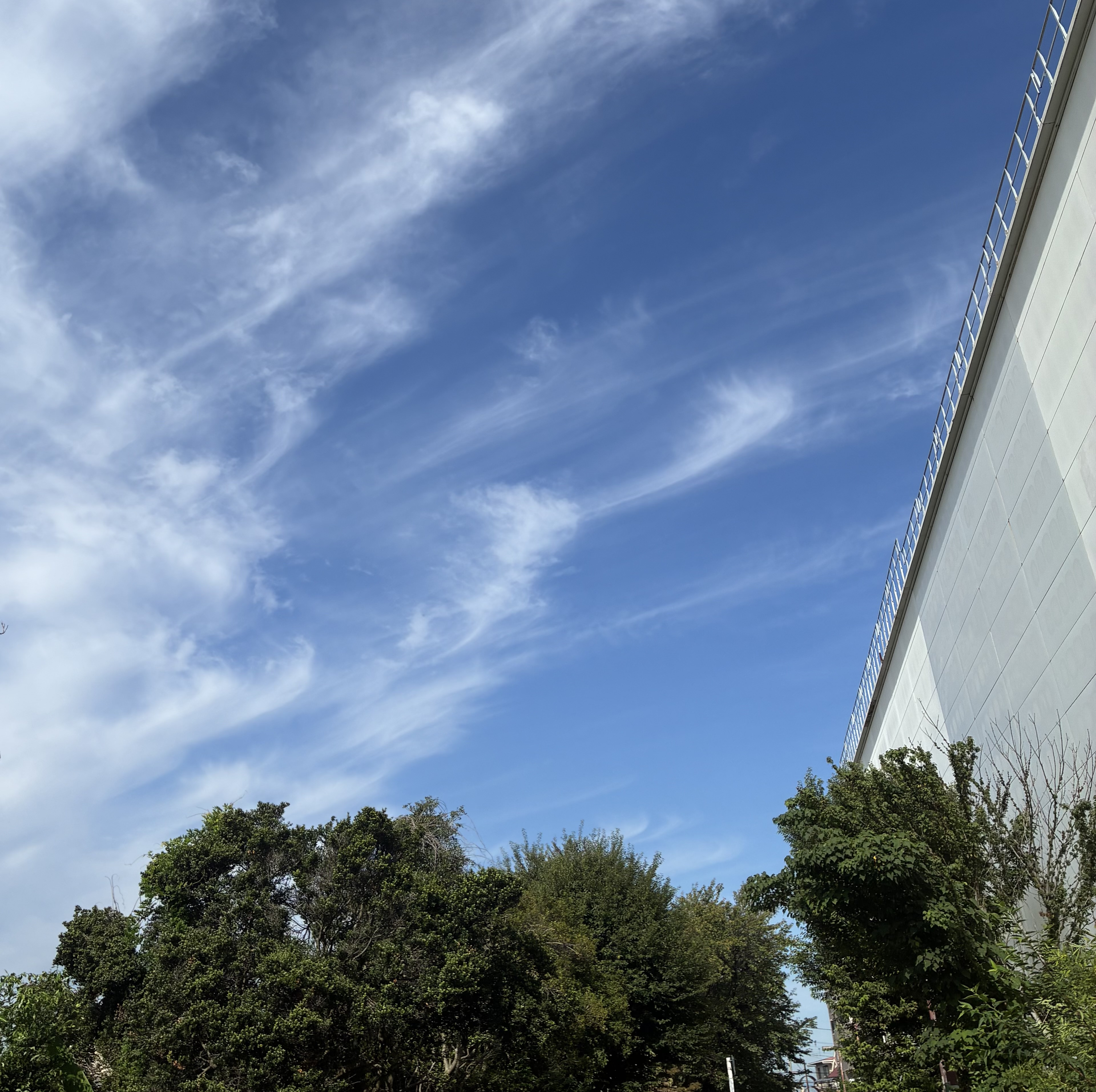 途中の朝の空は清々いという言葉がぴったり、、この鎌のような雲、、”すじ雲”です、、コットンを引き延ばしたかのような、その雲は、イワシ雲と同じように高度が一番高いところに現れます