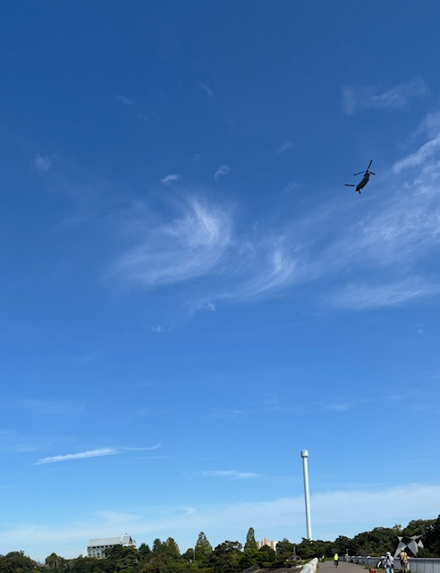 こちらもすじ雲です、空が高いな~、ヘリコプターまでも気持ちよさそうに見えてしまいます、子供たちも遠足でしょうか?