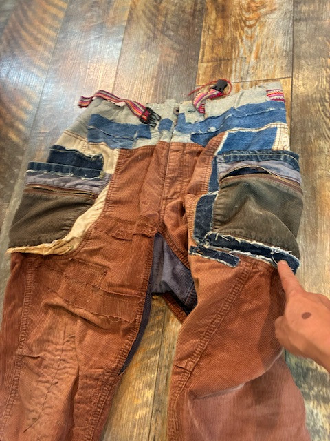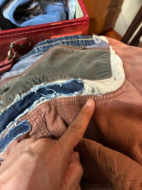 完了。、向かって左のひざあたりは、以前、大手術をしましたし、、デニムの生地のところは、すべて縫ったところです、どんどん、生地を補強して、縫って、、縫って、、縫いまくっています。