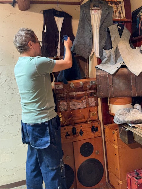 お店の革のトランクに保管してある、帽子やベスト、、このあたりも昨日のうちに出して、数日陰干しをしないといけません。