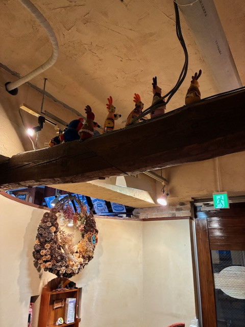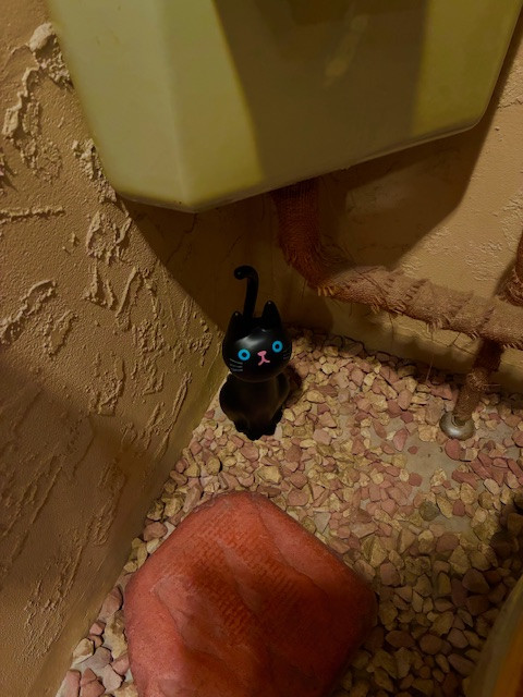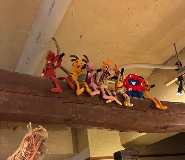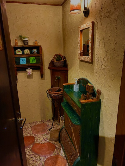 今では、ミャクミャクもココペリの仲間になっています。見上げたら奴らが居たんですが、、見上げてるやつもいるんです、、それはここ、ホッとする場所として作り上げた、ある意味、、ご自慢のトイレです。半分お見せしましょう、手作りです。