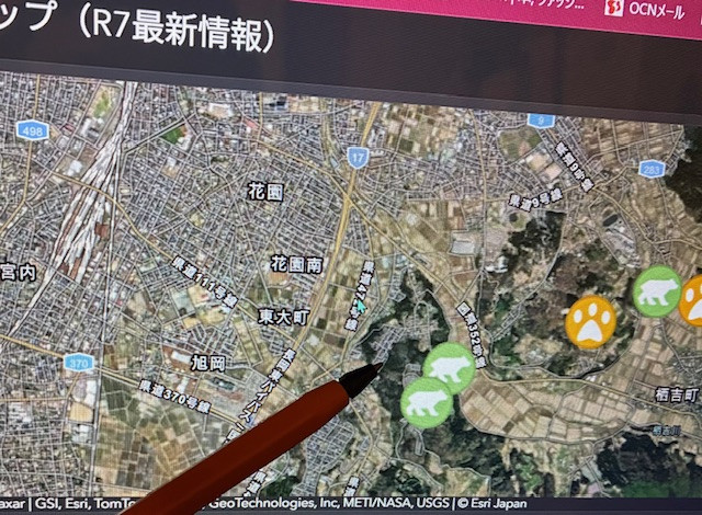 左隅が長岡の駅で、この指しているところが、、お墓のある所です。。クマの絵のところが目撃情報、足跡のマークがクマに襲われた印です。これは危険エリアと言うのがわかります。