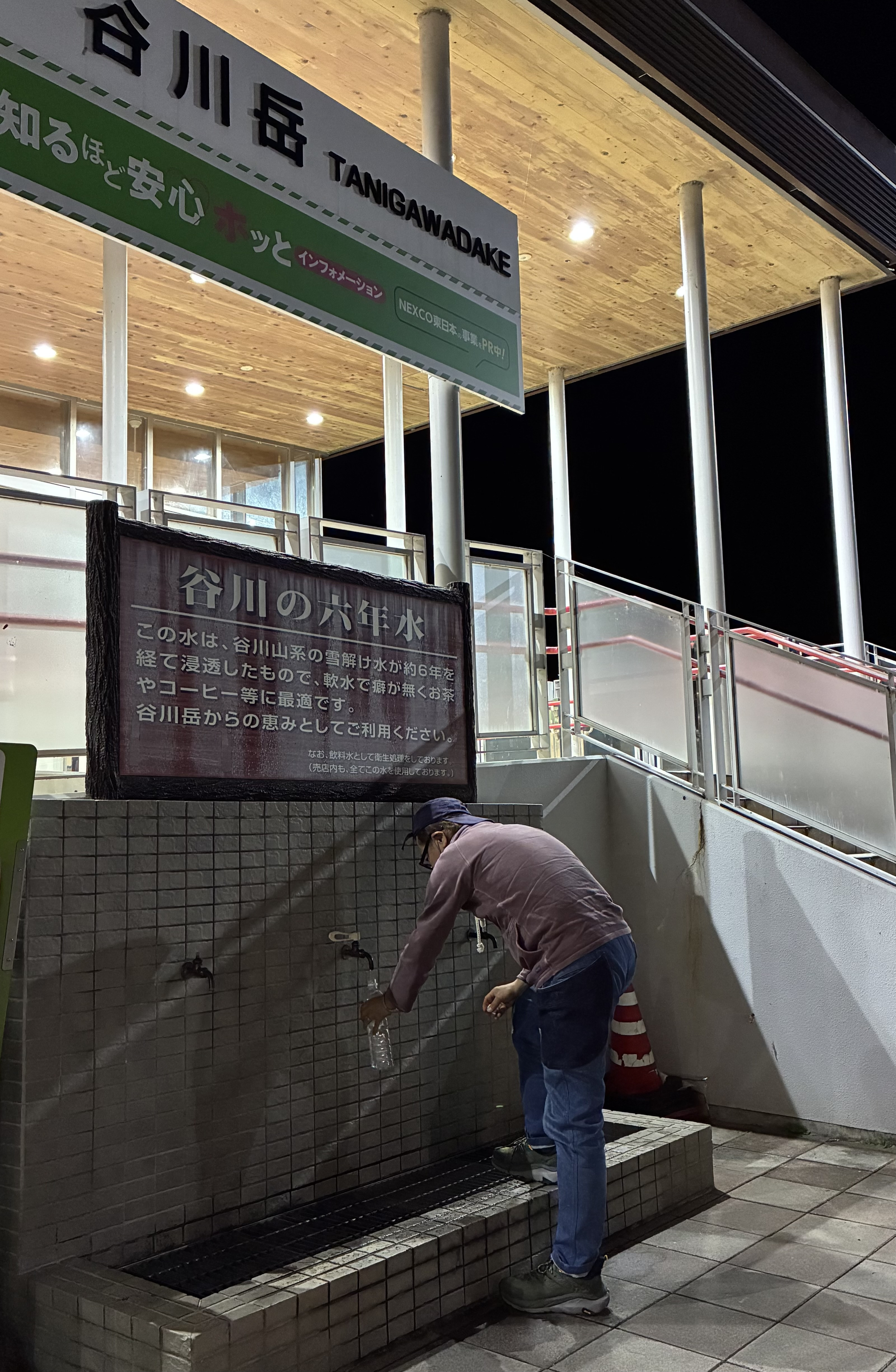 夜中に関越道を進んで、谷川岳PAで岩清水を汲んで、水分調達。