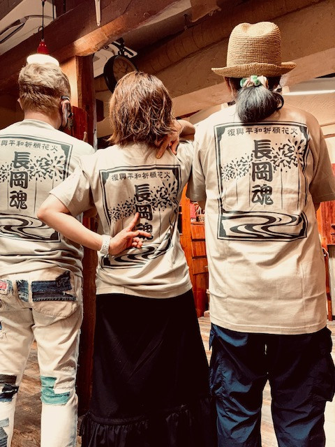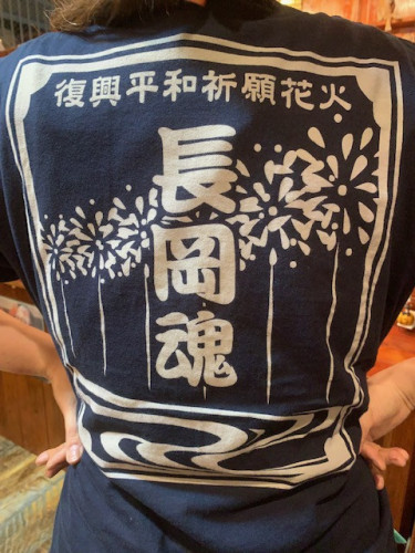 Tシャツが売られています、、その中で”らしくない”ある意味、異彩を放つのが~オフィシャルの花火財団が作る”復興平和祈願花火Tシャツ”、、長岡魂です。