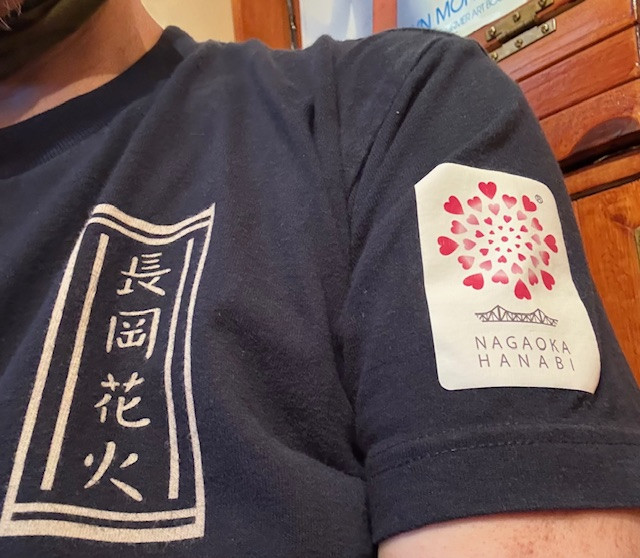 花火が登場、、、、そして復興花火第一弾として、フェニックスの花火、そして下を流れる信濃川、そこに長岡魂を配したTシャツが誕生、袖口には、もうひとつの名物、長岡の歴史建造物でもある