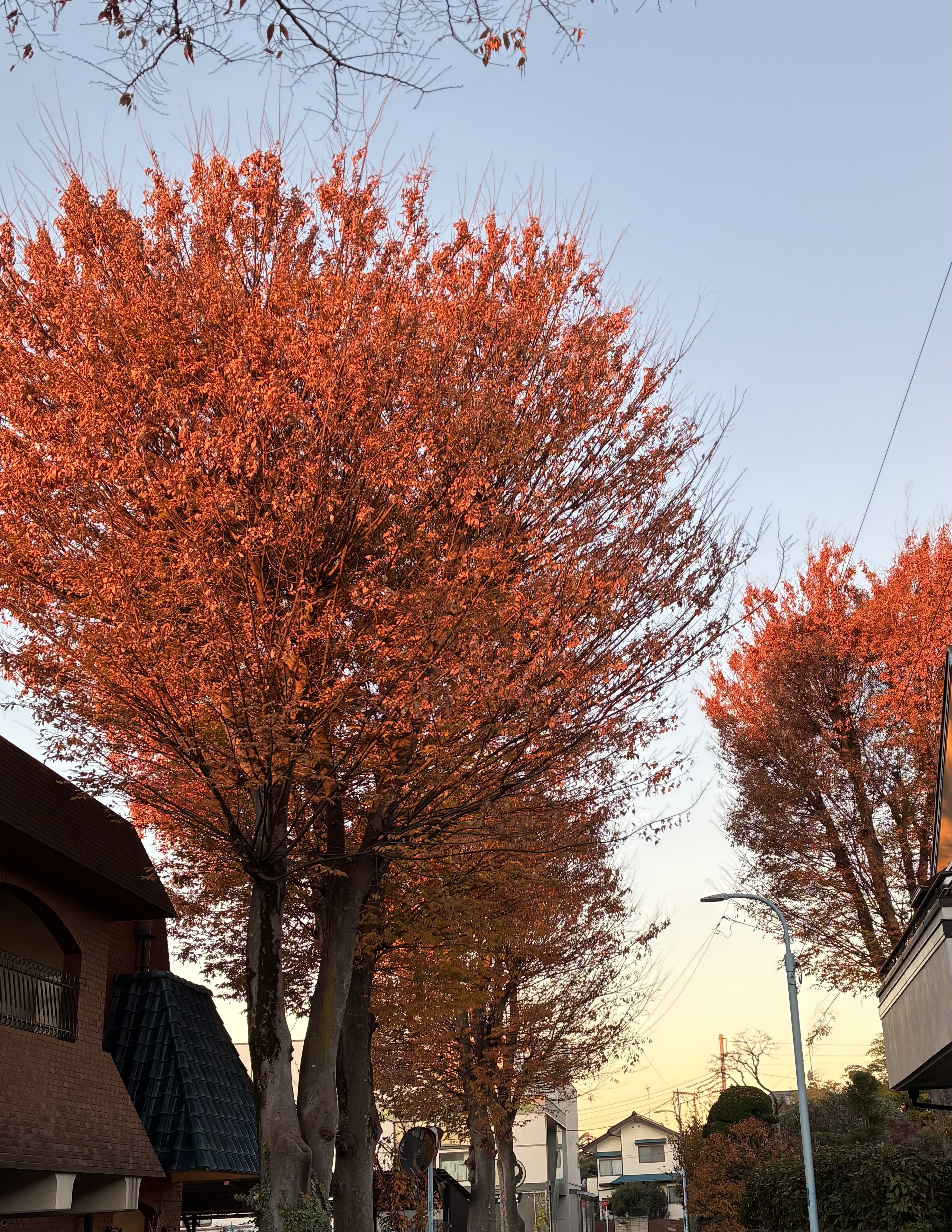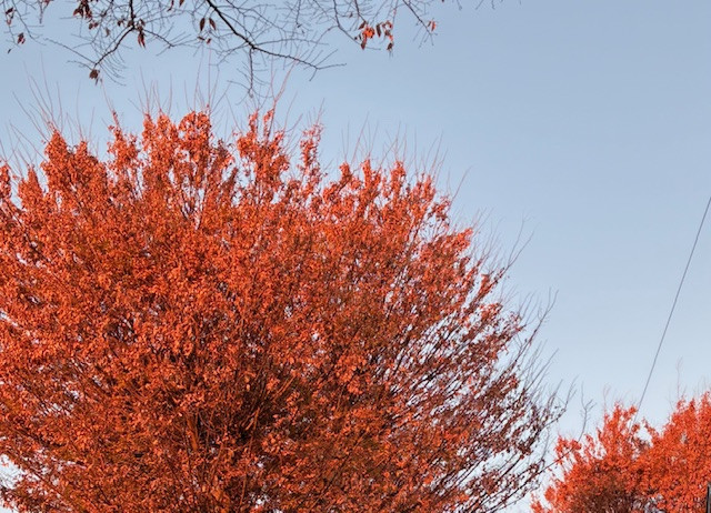 昨日の朝、6時50分、久我山のケヤキ通りのけやきたちは、朝日にてらされ、紅葉しているようでした。