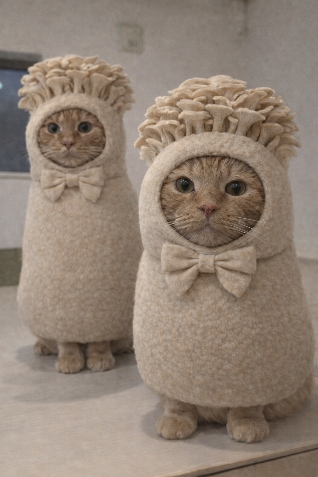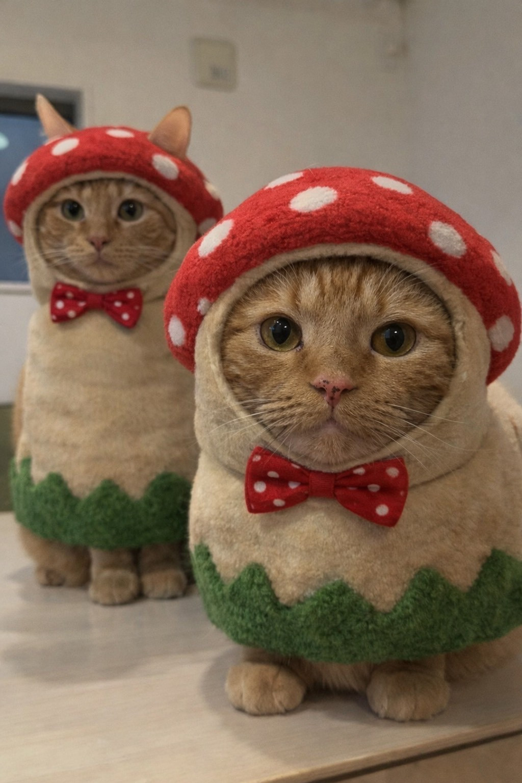 どんな猫になるのかは、ChatGPT次第ですから、それぞれの猫のポーズで色んなきのこ猫が誕生