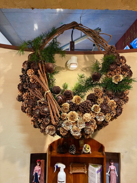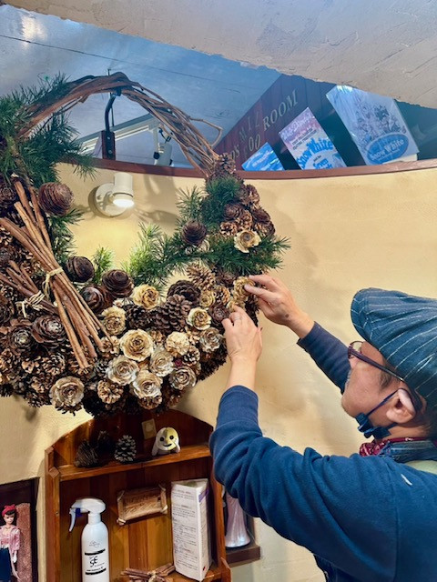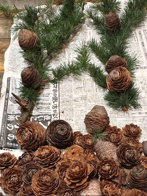 その土台となる、巨大なリースに松、、そして松笠をとりつけ化粧直しをします。