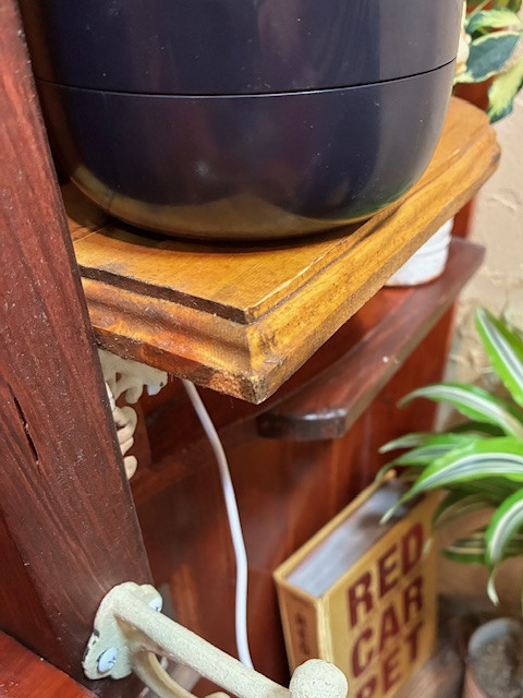 躯体の棚を残すことを選択して、まずやったのが、足元の加工でした、、、まさに”棚”と言う位置づけから、アンティークな”キャビネット”にしたいと思ったわけです、、もちろん”なんちゃって”なんですが、ゴールが見えているのと、見えないのとでは、”とりあえず感”がまるで違います。