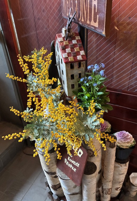 残りの葉ボタンは、入り口の街灯の下に移動、、ミモザ、多肉、勿忘草、そして葉ボタンと