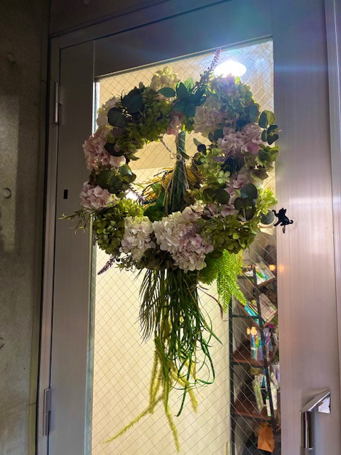 お隣森山歯科とのエントランスに移動、、森山歯科の入り口には、こちらも新作のフラワーアレンジメントが登場。