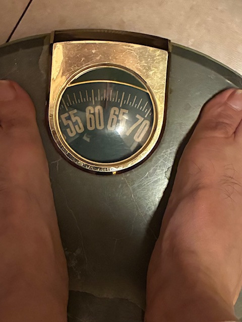 ただ困ったもので、、この体重計の針が、、見えない( ̄∇ ̄;)ハッハッハ、、体重計って、座って測ったらいけないんですかね?当たり前に立ちますよね?なんか勝手なイメージは、座ったほうが重たいような?、、な、訳ないですよね?いはデジタル表記な体重計なんですが、、其れだと見えるんですが、充電切れ、、仕方なく今日はこちらでしたが、、スマホで撮って確認です。