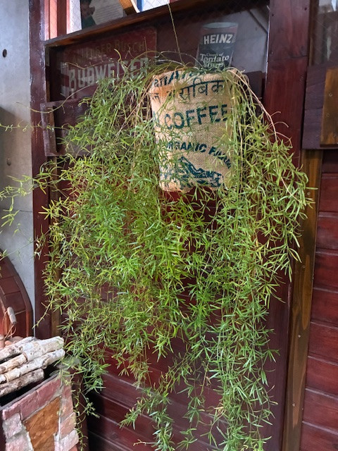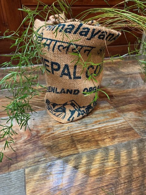 ネパール産のコーヒー豆の麻袋で,包み込みます、、色合いも緑の字ですからいいですね~。